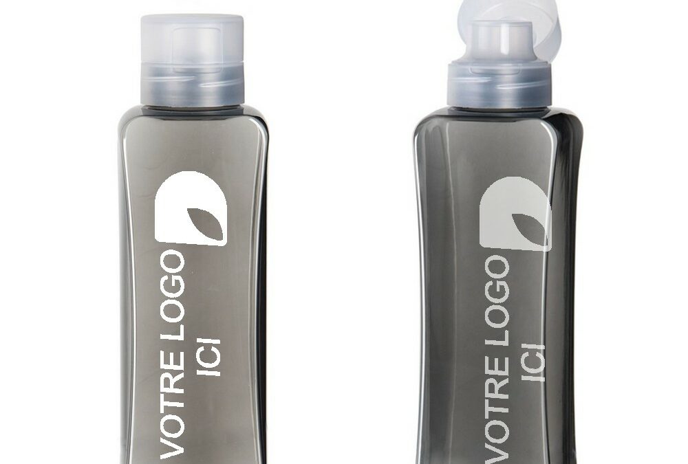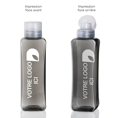 Bouteilles personnalisées Acquadri grise, personnalisation 1 face. Impression soit sur la face avant, soit sur la face arrière avec vue en transparence